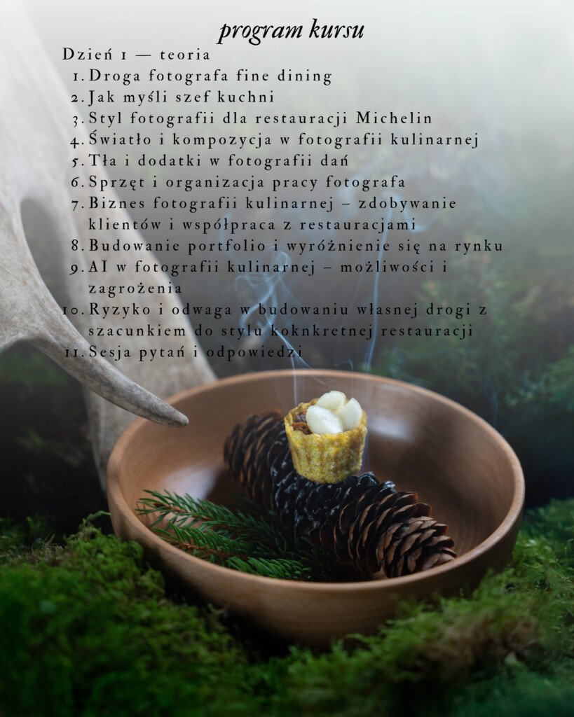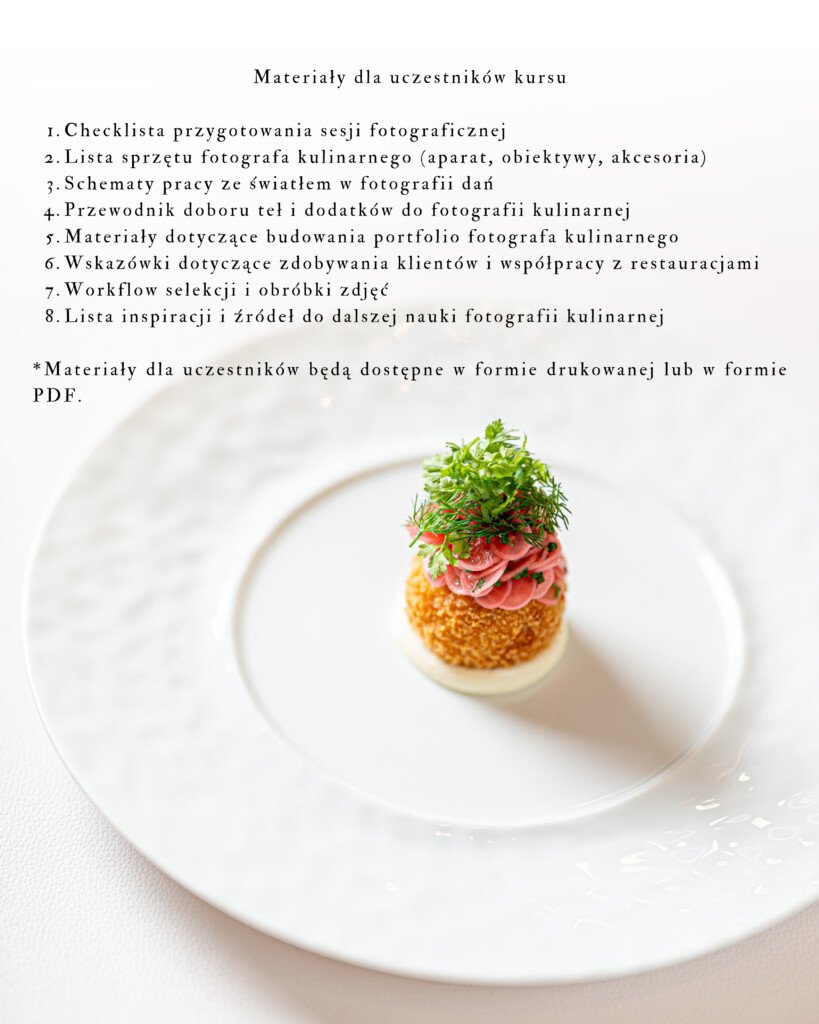 Podczas kursu pokazuję nie tylko technikę fotografii kulinarnej, ale także jak wygląda realna praca fotografa w restauracjach fine dining — od organizacji sesji po zdobywanie klientów.